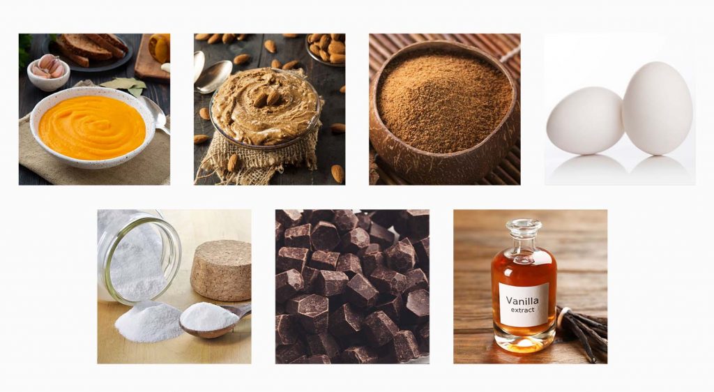 1 cup pumpkin puree, 1/3 cup almond butter, 1/2 cup coconut sugar, 2 eggs, 1/2 cup cocoa powder, 1 teaspoon baking powder, 1/4 teaspoon salt, 1 teaspoon vanilla extract, 1/2 cup dark chocolate chips.