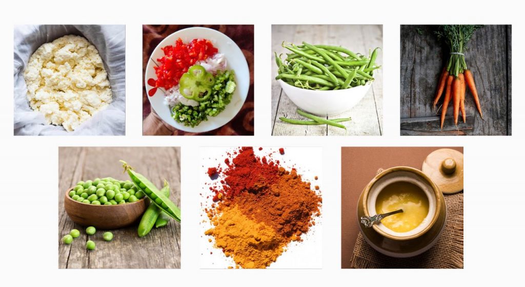 1 cup paneer, crumbled;1/2 cup mixed vegetables, diced (carrots, green beans, peas, etc.); 1/4 teaspoon garam masala;1/4 teaspoon cumin powder; Salt, to taste;1 tablespoon oil; 1/2 cup all-purpose flour; 2 tablespoons ghee